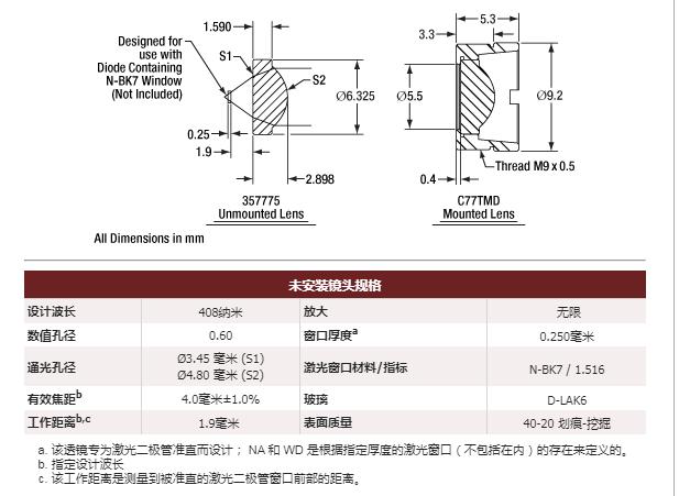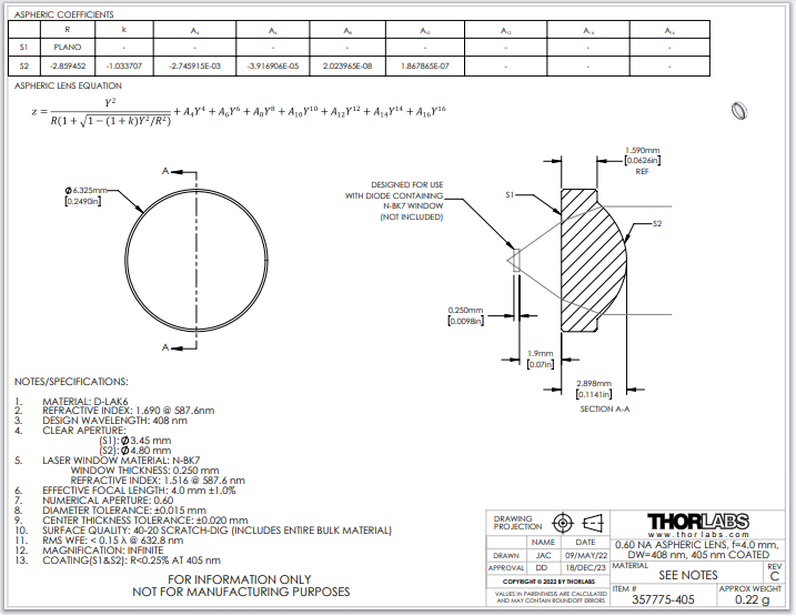 Thorlabs索雷博 357775-405 非球面透镜