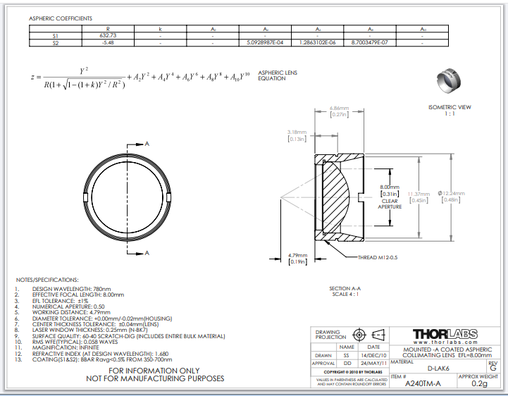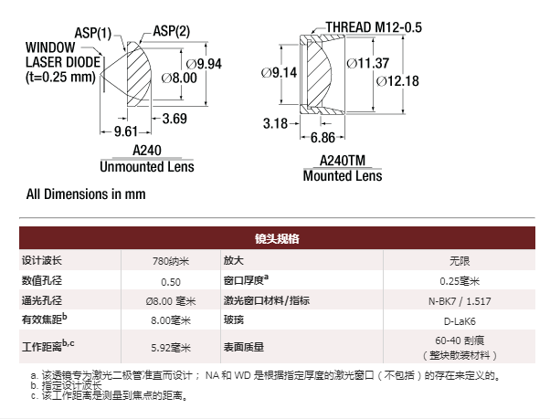 Thorlabs索雷博 A240TM-A 非球面透镜
