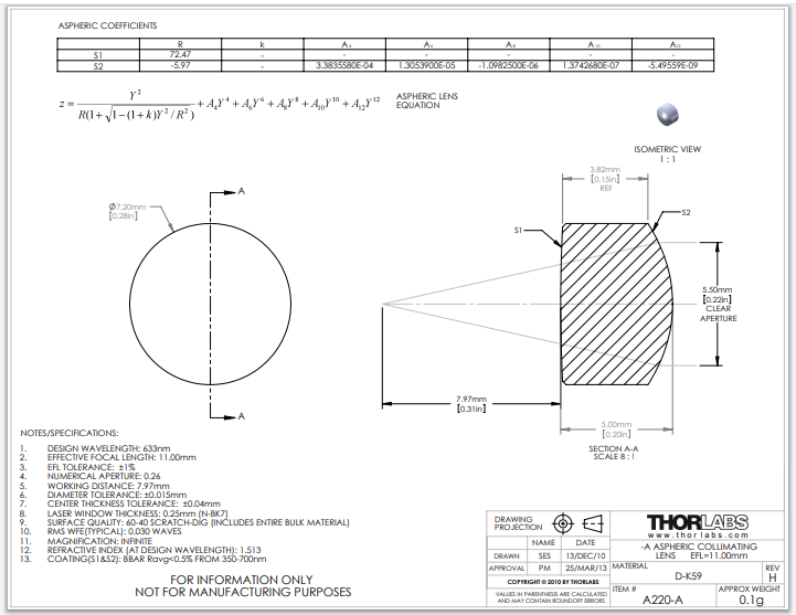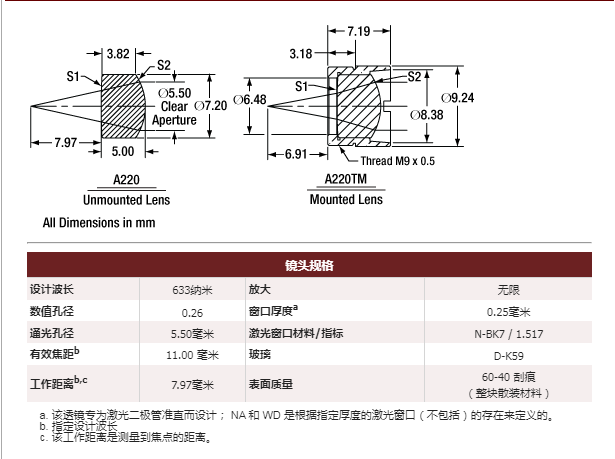 Thorlabs索雷博 A220-A 非球面透镜