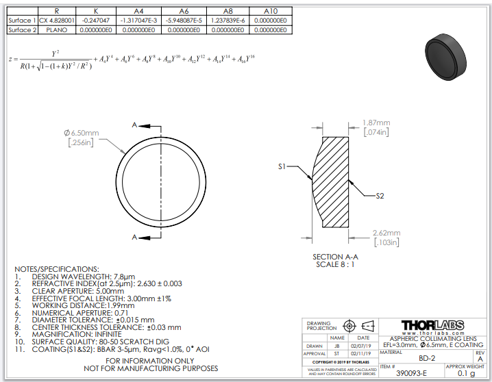 Thorlabs索雷博     390093-E   非球面透镜