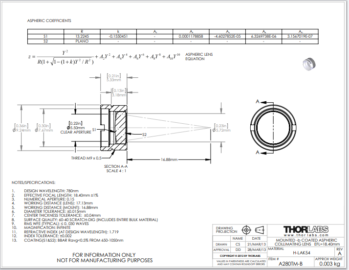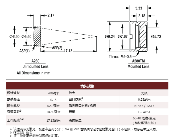 Thorlabs索雷博 A280TM-B 非球面透镜