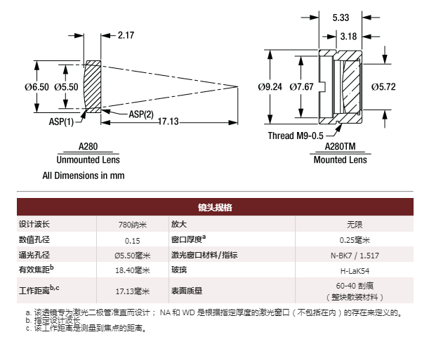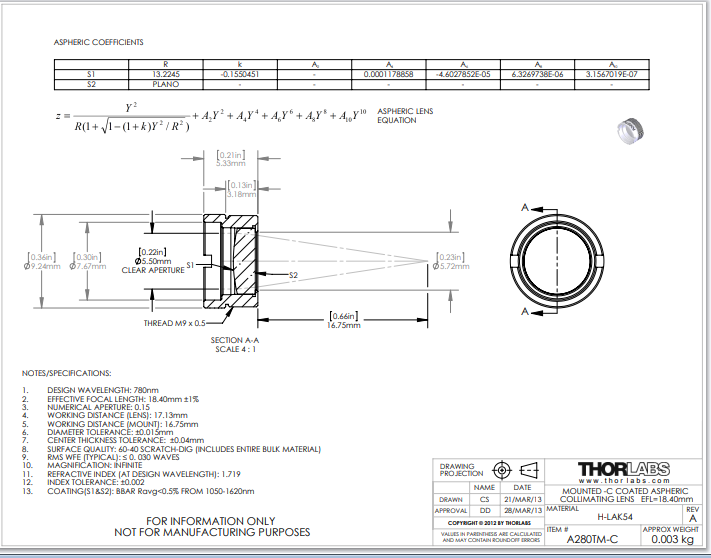 Thorlabs索雷博     A280TM-C   非球面透镜