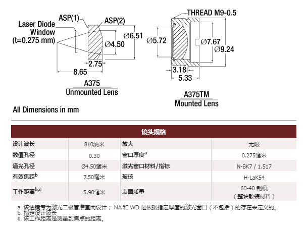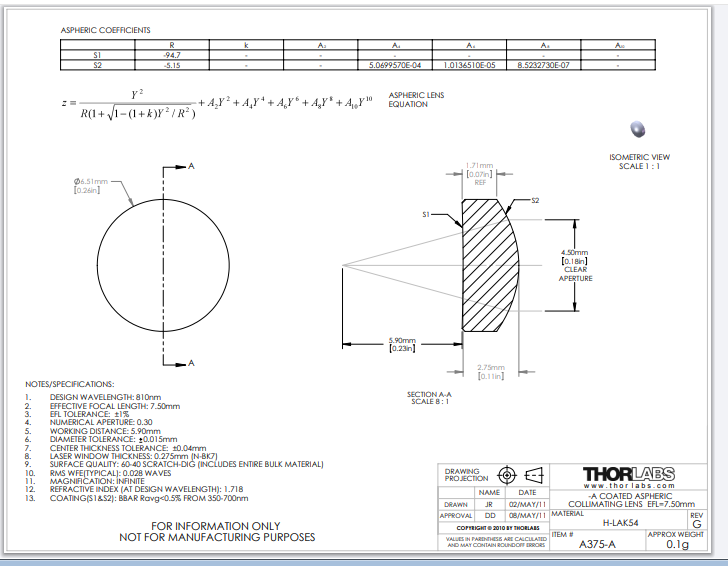 Thorlabs索雷博 A375-A 非球面透镜