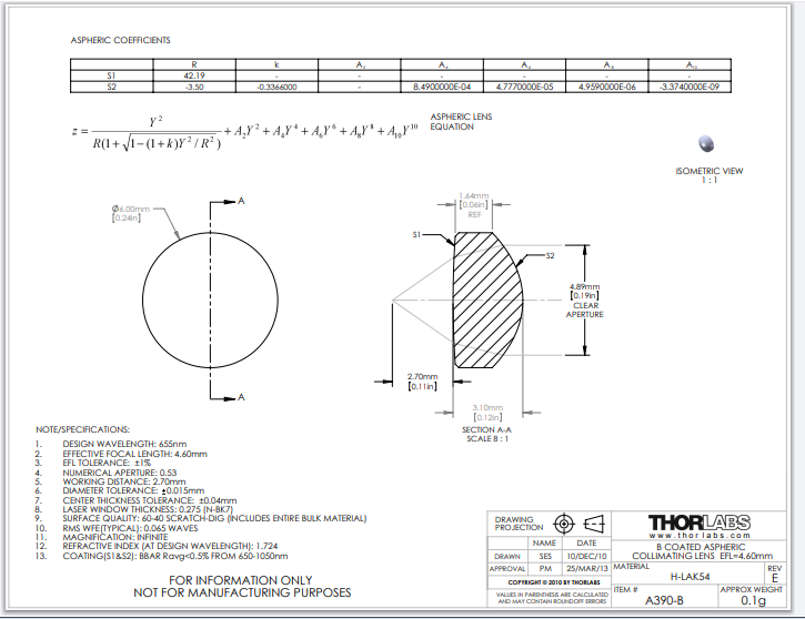 Thorlabs索雷博     A390-B   非球面透镜