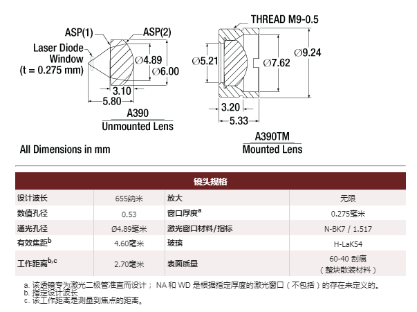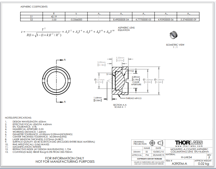 Thorlabs索雷博 A390TM-A 非球面透镜