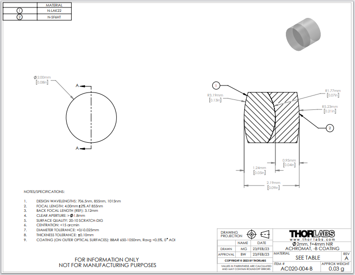 Thorlabs索雷博 AC020-004-B 消色差双胶合透镜