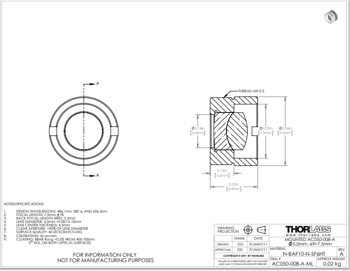 Thorlabs索雷博 AC050-008-A-ML 消色差双胶合透镜