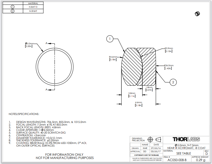 Thorlabs索雷博 AC050-008-B 消色差双胶合透镜