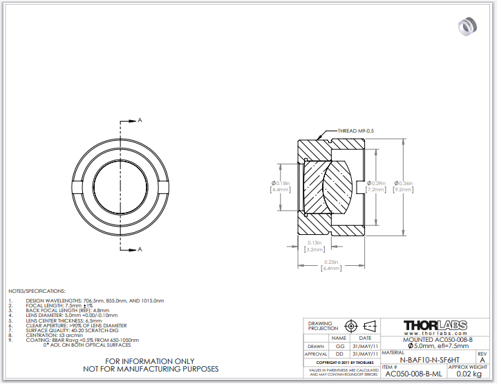 Thorlabs索雷博     AC050-008-B-ML   消色差双胶合透镜