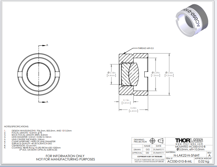 Thorlabs索雷博 AC050-010-B-ML 消色差双胶合透镜