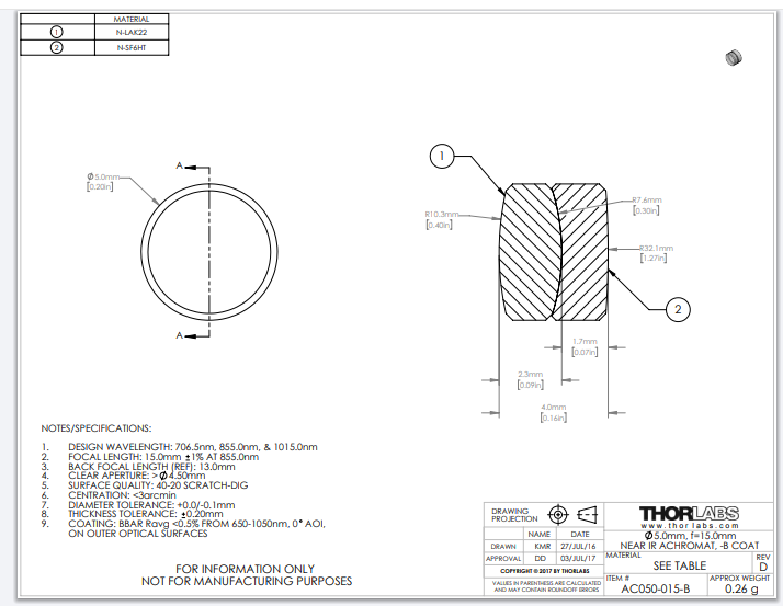 Thorlabs索雷博 AC050-015-B 消色差双胶合透镜