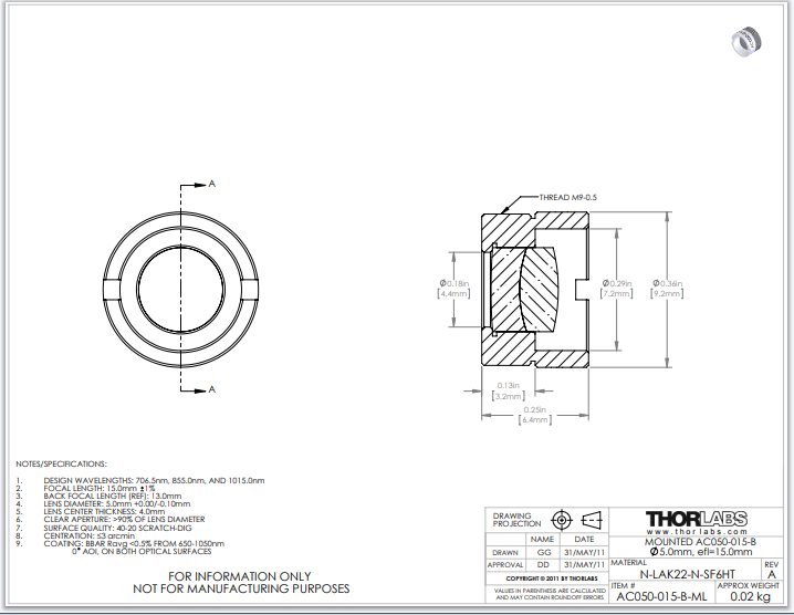 Thorlabs索雷博     AC050-015-B-ML   消色差双胶合透镜