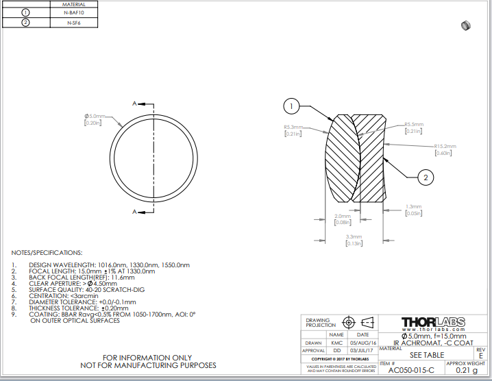 Thorlabs索雷博 AC050-015-C 消色差双胶合透镜