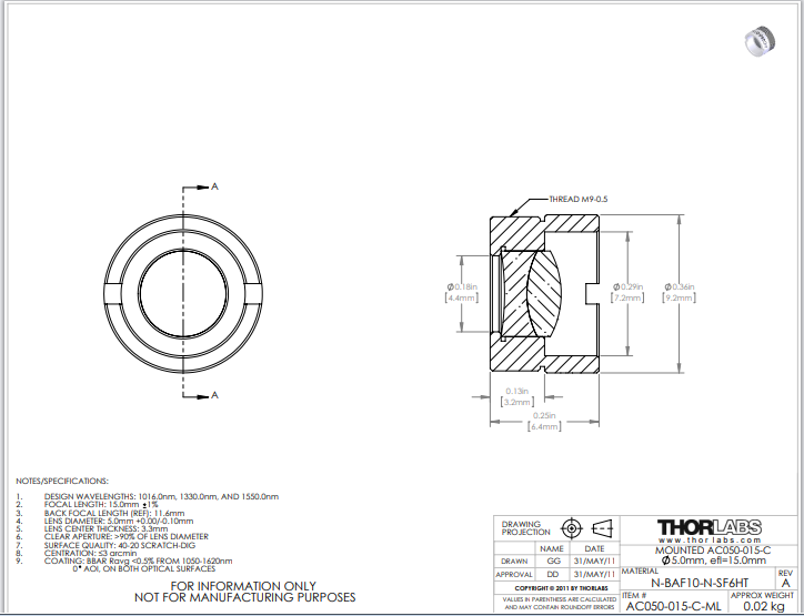 Thorlabs索雷博 AC050-015-C-ML 消色差双胶合透镜