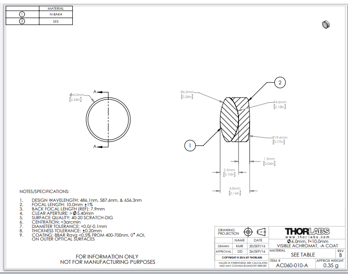 Thorlabs索雷博 AC060-010-A 消色差双胶合透镜