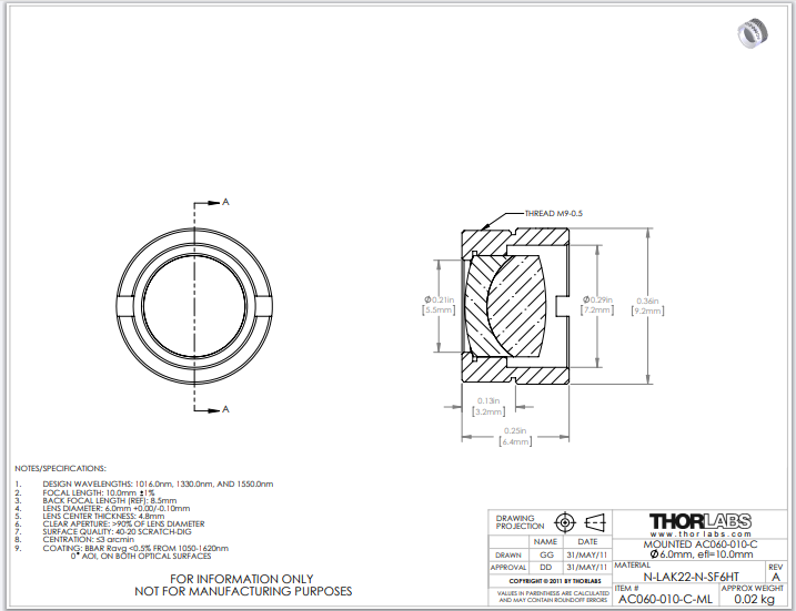 Thorlabs索雷博 AC060-010-C-ML 消色差双胶合透镜