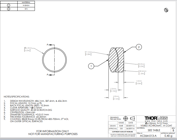 Thorlabs索雷博     AC064-013-A   消色差双胶合透镜