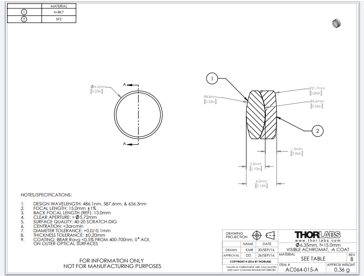 Thorlabs索雷博     AC064-015-A   消色差双胶合透镜