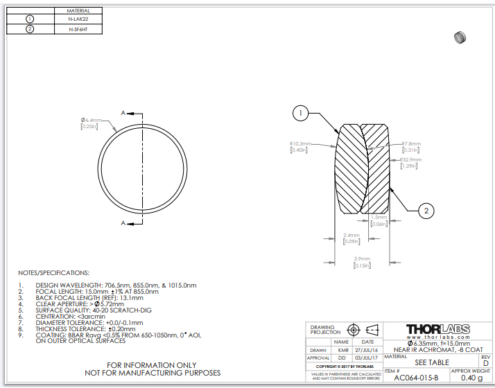 Thorlabs索雷博 AC064-015-B 消色差双胶合透镜