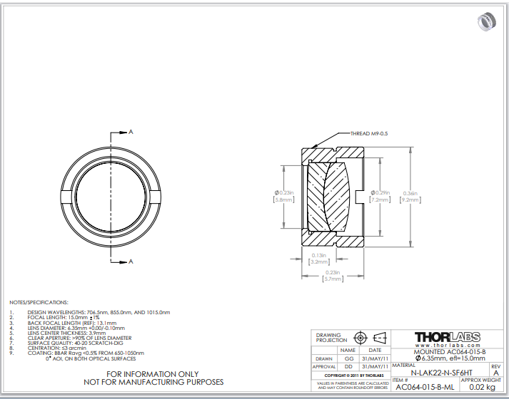 Thorlabs索雷博     AC064-015-B-ML   消色差双胶合透镜