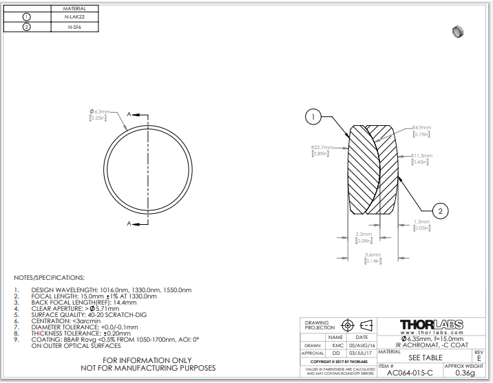 Thorlabs索雷博 AC064-015-C 消色差双胶合透镜