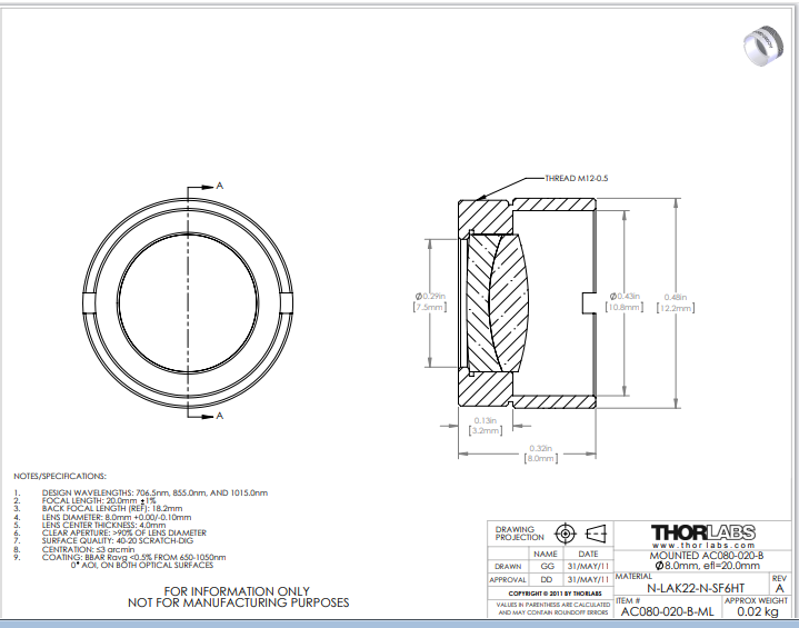 Thorlabs索雷博 AC080-020-B-ML 消色差双胶合透镜