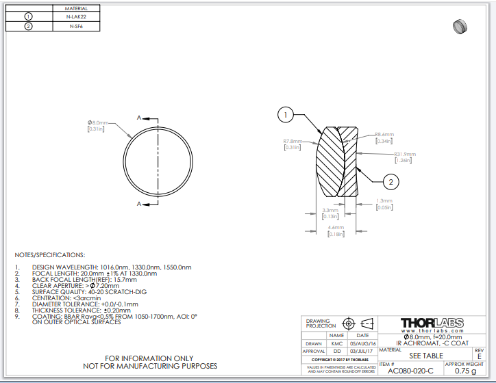 Thorlabs索雷博 AC080-020-C 消色差双胶合透镜