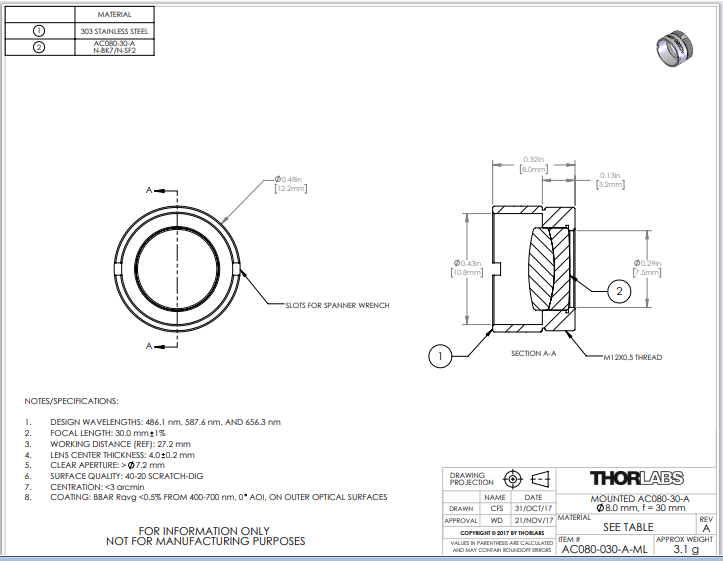 Thorlabs索雷博 AC080-030-A-ML 消色差双胶合透镜