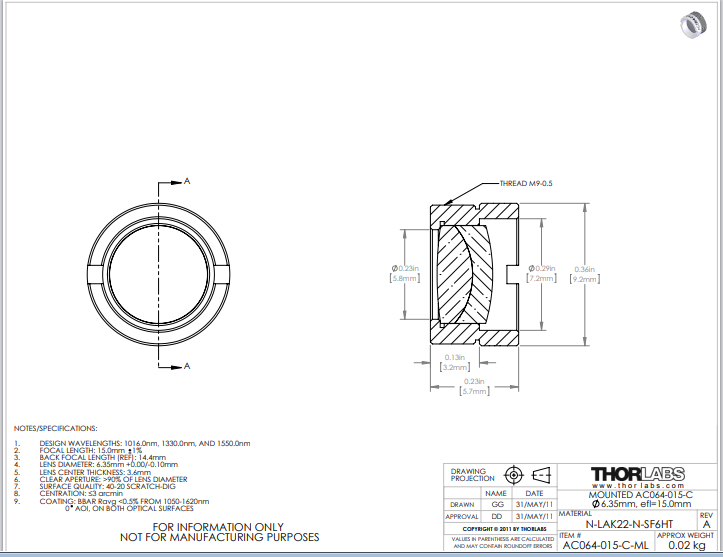 Thorlabs索雷博 AC064-015-C-ML 消色差双胶合透镜