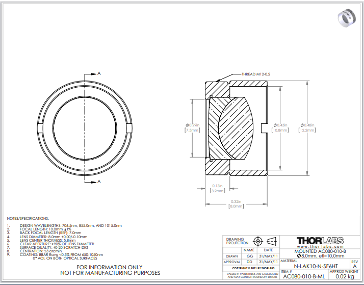 Thorlabs索雷博 AC080-010-B-ML 消色差双胶合透镜