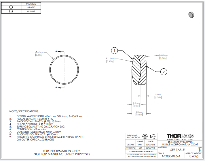 Thorlabs索雷博 AC080-016-A 消色差双胶合透镜