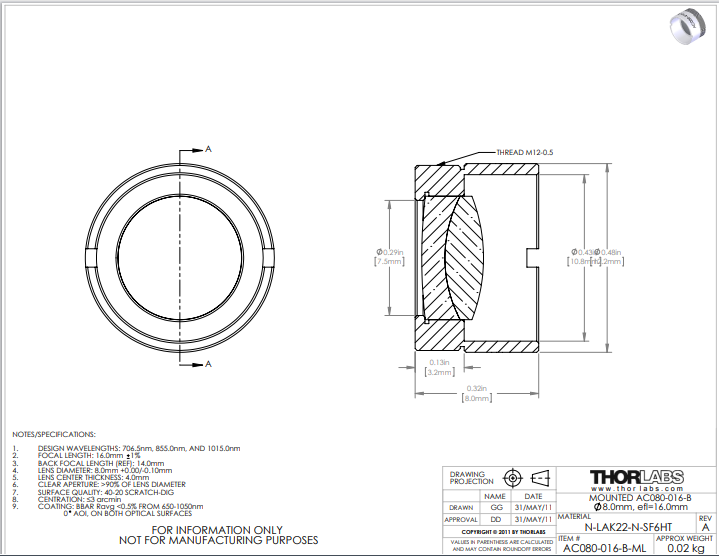 Thorlabs索雷博 AC080-016-B-ML 消色差双胶合透镜
