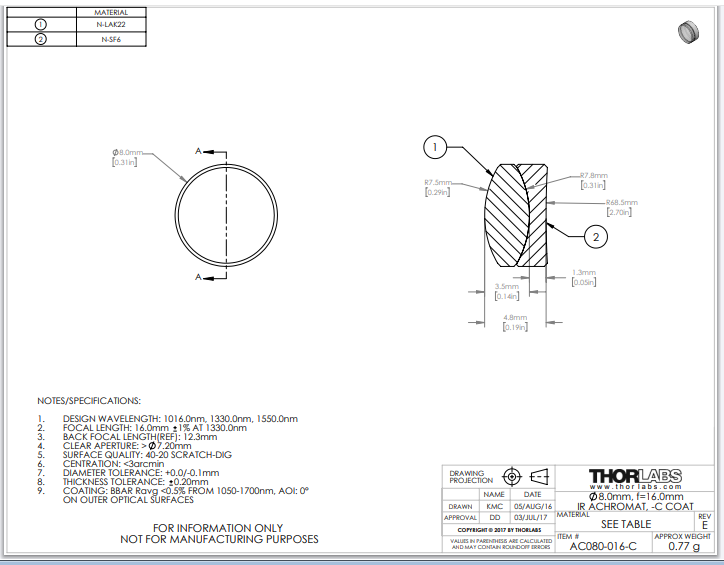 Thorlabs索雷博     AC080-016-C   消色差双胶合透镜