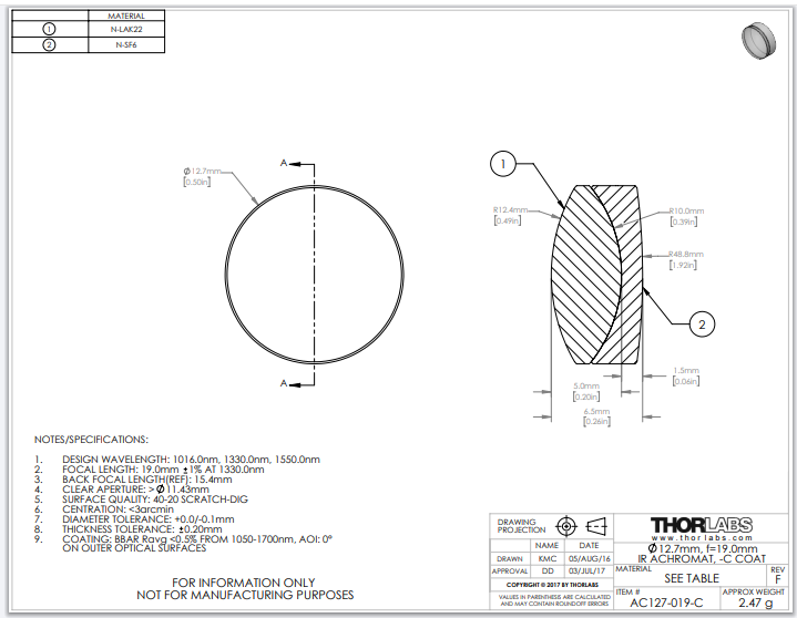 Thorlabs索雷博 AC127-019-C 消色差双胶合透镜