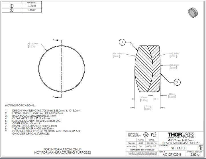 Thorlabs索雷博 AC127-025-B 消色差双胶合透镜