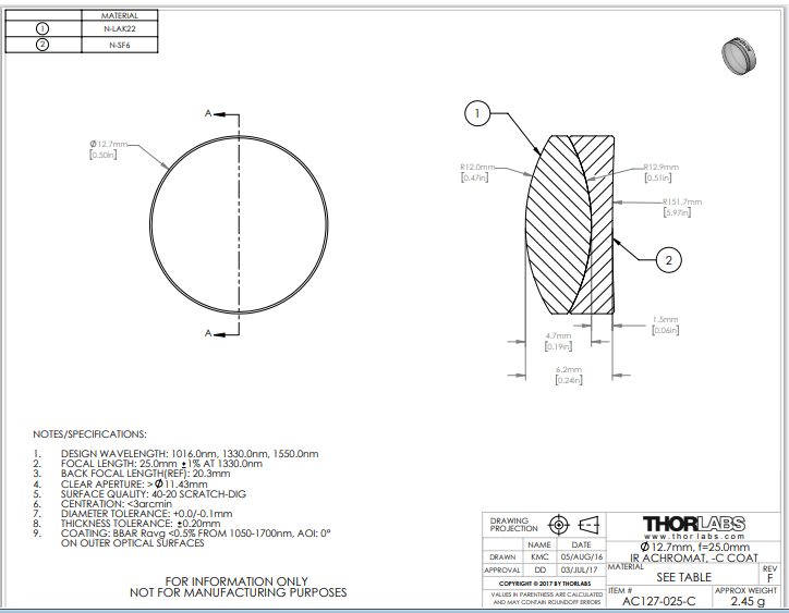 Thorlabs索雷博 AC127-025-C 消色差双胶合透镜