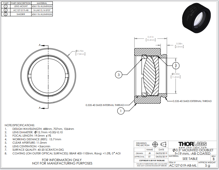 Thorlabs索雷博 AC127-019-AB-ML 消色差双胶合透镜