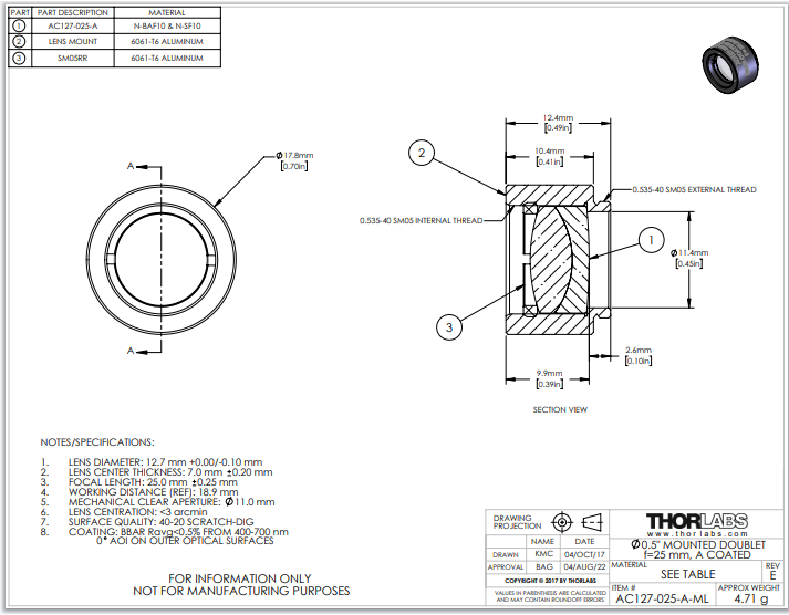 Thorlabs索雷博 AC127-025-A-ML 消色差双胶合透镜
