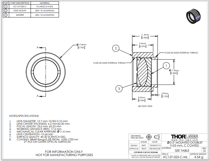 Thorlabs索雷博 AC127-025-C-ML 消色差双胶合透镜