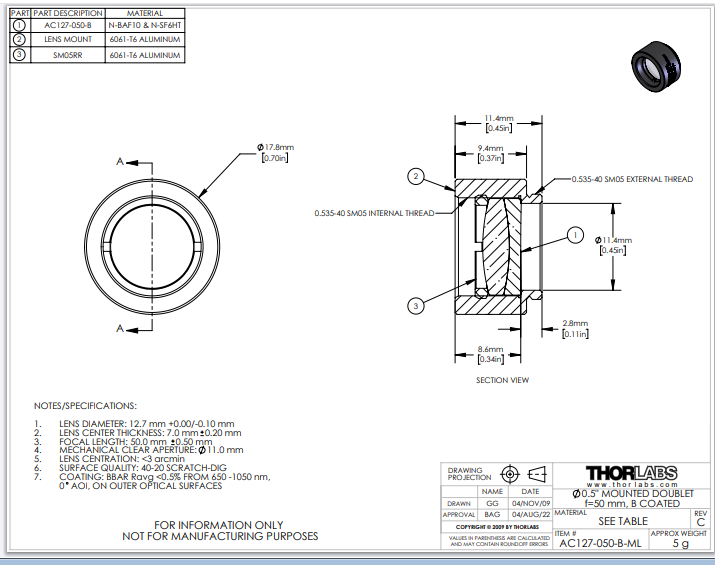Thorlabs索雷博 AC127-050-B-ML 消色差双胶合透镜