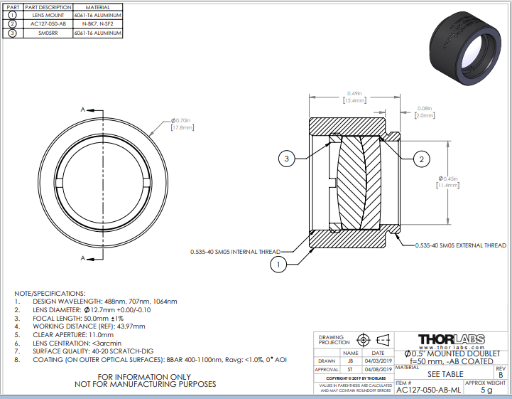 Thorlabs索雷博 AC127-050-AB-ML 消色差双胶合透镜