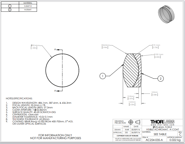 Thorlabs索雷博 AC254-035-A 消色差双胶合透镜