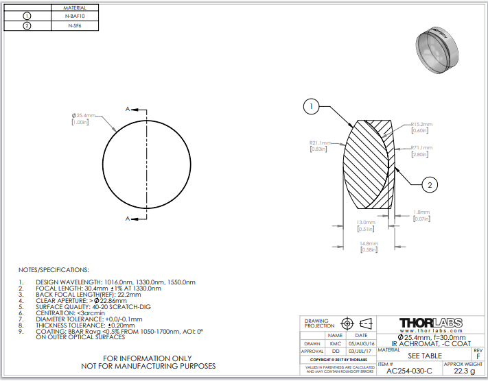 Thorlabs索雷博 AC254-030-C 消色差双胶合透镜