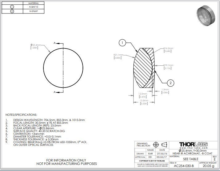 Thorlabs索雷博     AC254-030-B   消色差双胶合透镜