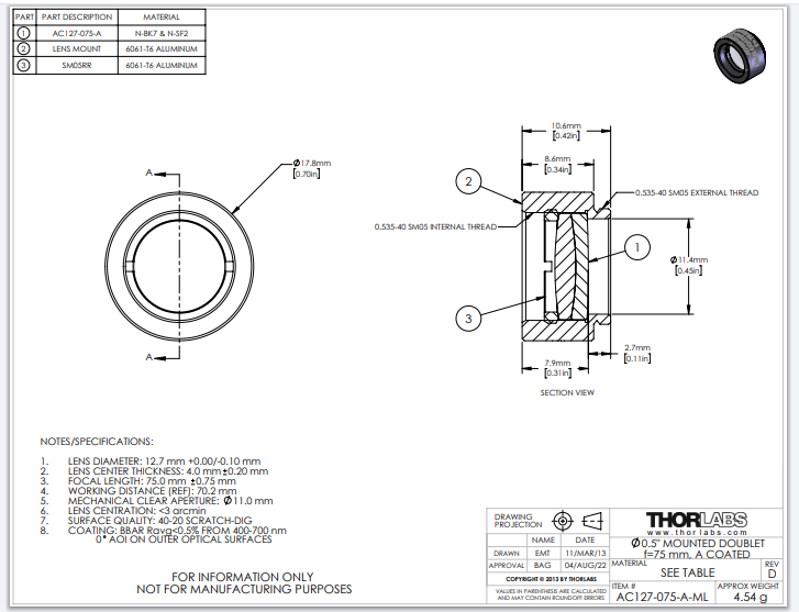 Thorlabs索雷博 AC127-075-A-ML 消色差双胶合透镜