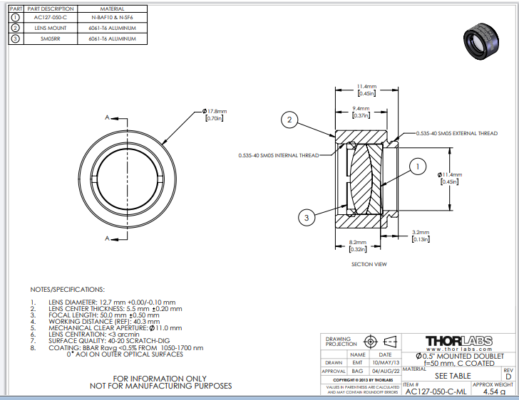 Thorlabs索雷博 AC127-050-C-ML 消色差双胶合透镜