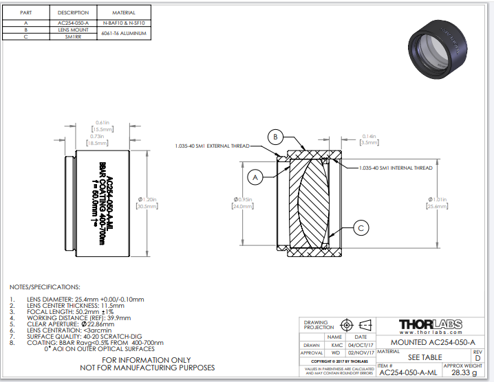 Thorlabs索雷博 AC254-050-A-ML 消色差双胶合透镜