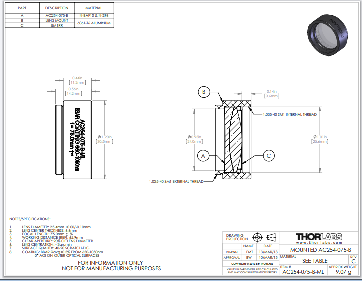Thorlabs索雷博     AC254-075-B-ML   消色差双胶合透镜