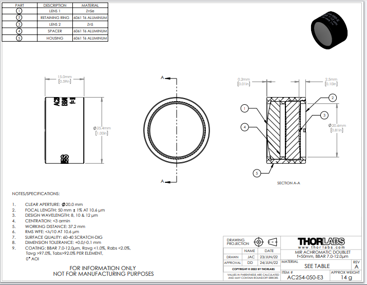 Thorlabs索雷博     AC254-050-E3   空气隙消色差双合透镜