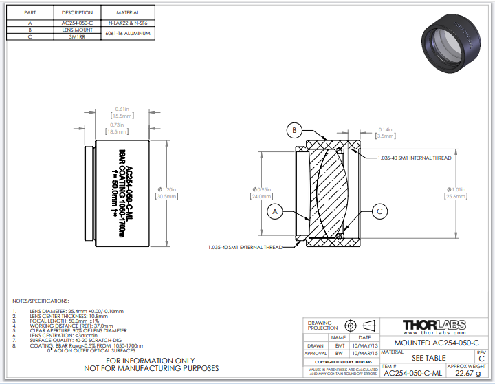 Thorlabs索雷博 AC254-050-C-ML 消色差双胶合透镜